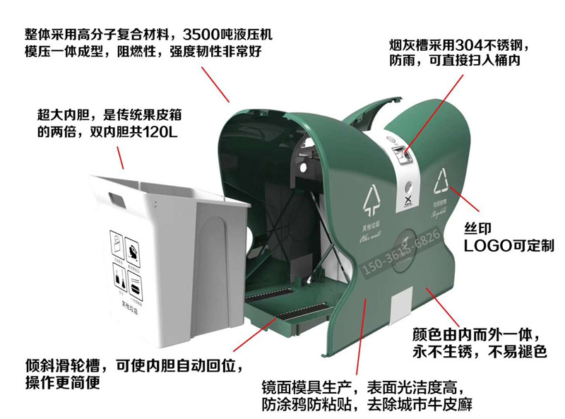 2. 產品特點: 鏡面模具生產,表面光潔度高,防涂鴉防粘貼,防砸,耐燒,永不生銹,不易褪色,耐酸堿,易清洗,使用壽命長,具有天然的防盜功能;操作簡單,深受環衛系統客戶青睞。