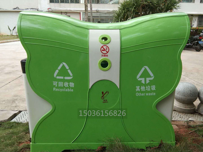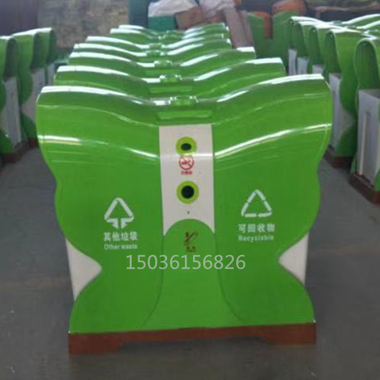 蝴蝶型分類環保垃圾桶果皮箱采用SMC復合材料,3500噸壓機模壓成型,內外光潔度一致。蝴蝶果皮箱采用鏡面模具生產,表面光潔度高,防涂鴉防粘貼,防砸,耐燒,永不生銹,不易褪色,耐酸堿,易清洗,使用壽命長,操作簡單,深受環衛系統客戶青睞。玻璃鋼蝴蝶垃圾桶產品結構特點: 產品外型:造型獨特,美觀大方,創新的設...